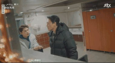 结果,嘴角粘着饭米粒的俊基,在卫生间里和朴前辈偶遇↓