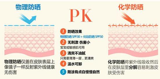 1、防晒效果:物理防晒SPF30 >化学防晒SPF50
