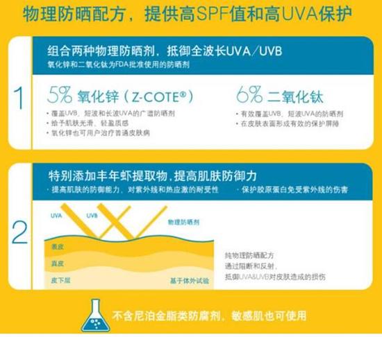 内含6%二氧化钛和5%氧化锌成分,不添加酒精和香料,能够长时间反射紫外线,为包括敏感肌在内的所有肌肤提供高效安全、覆盖全波长UVA/UVB的广谱防晒保护。使用感上,和所有的物理防晒剂一样,涂上最开始会泛白,但过一会就没有颜色了,比较干爽不油,追求纯物理防晒的混油皮都可以用。激光美容后医生同样推荐使用!