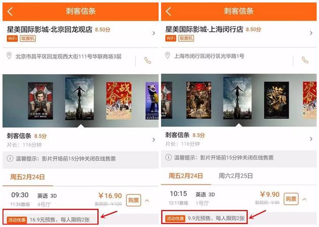 登录星美生活/官网/APP/微信购《刺客信条》、《生化危机》均可享受9.9元起特惠全国星美影城特惠价以下单显示活动为准【9.9元/16.9元/19.9元】,每人可购2张(VIP&IMAX厅等特殊场次除外)。