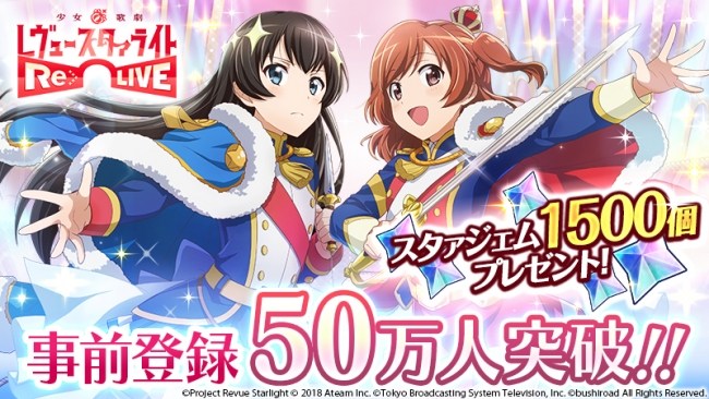 游戏《少女☆歌剧 レヴュースタァライト -Re LIVE-》目前的事前登录人数已达50万,全体玩家将会在游戏推出后,获得不少于1500星石的特典。