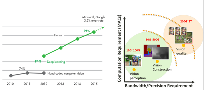 第三组(测试4、5、6、8)则是使用CNN结构(Convolutional Neural Network,卷积神经网络技术,即基于深度学习)的端到端的超分辨率算法SRCNN(Super-Resolution)进行的图形像素化部分,主要测试的部分包括图形去模糊、多元化的图像超分辨率和图形增强,目前传统的手动编码框架对物体识别的精度基本上都没有超过74%,而2012年引入的深度神经网络(DNNS)则将这一准确率提高到84%,不过在微软、Google等企业的推动下,这部分的准确率已经高达96%,不仅远超出人类的辨别能力,而且也大幅改善了AI的实用能力。