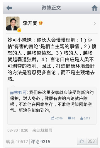您经常说自己主张言论自由,主张多种观点并存。但是您却对一切和您有不同意见的人进行打压和封杀。每一个爱国人士的微博在新浪都遭遇过封杀和屏蔽。直到今天像我周小平这样的爱国者微博账户直到今天,每天都会有许多好友莫名其妙地被取消关注,我有很多微博的转发或评论都莫名其妙地消失了,这种状况几乎每一个爱国者都在遭遇。中国的各大网络论坛、搜索引擎、聊天室、时尚杂志、出版公司、电视台热门观点栏目、影视创作团队、微博微信内容主管、甚至一些媒体官方微博很多都是您的粉丝,而其中不乏大量的反政府反社会甚至是反人类思想通过这些渠道疯狂传播。