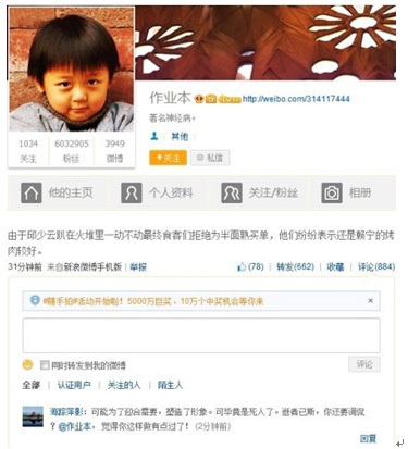 2013年著名微博大谣棍@作业本发布消息称:“由于邱少云趴在火堆里一动不动最终食客们拒绝为半面熟买单,他们纷纷表示还是赖宁的烤肉较好。”之后遭万人痛斥,但您李开复却表示:“作业本是一个有思想才华,充满黑色幽默,我行我素的屌丝愤青死胖子。他骂过很多人,也骂过我,但是我还是欣赏他。我觉得他是一个天生就该写微博的人,也是一个可以知道分寸的人。”