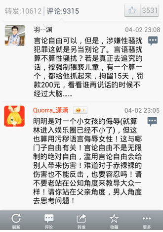我认为对这件事,您应该公开做出解释。否则很难不让人联想到去年有网友指出您曾经在美国加州的坎贝尔因涉嫌性骚扰一名叫Aimee的十三岁儿童而被起诉过这一事件究竟是真是假。面对这一网友爆料,您当时解释说可以去查法院的公开卷宗,肯定查不到。但我们都知道根据美国法律,那些达成庭外和解的案子本来就没有卷宗,所以我认为您应该组建一个网友调查团去到坎贝尔与Aimee的父亲当面对峙,以还原事实真相。如果是有人造谣,就依法追究造谣者的责任,如果不是造谣,那么您欠中国的林姓小姑娘一个道歉。